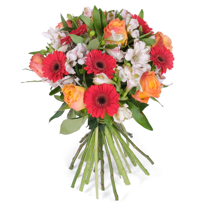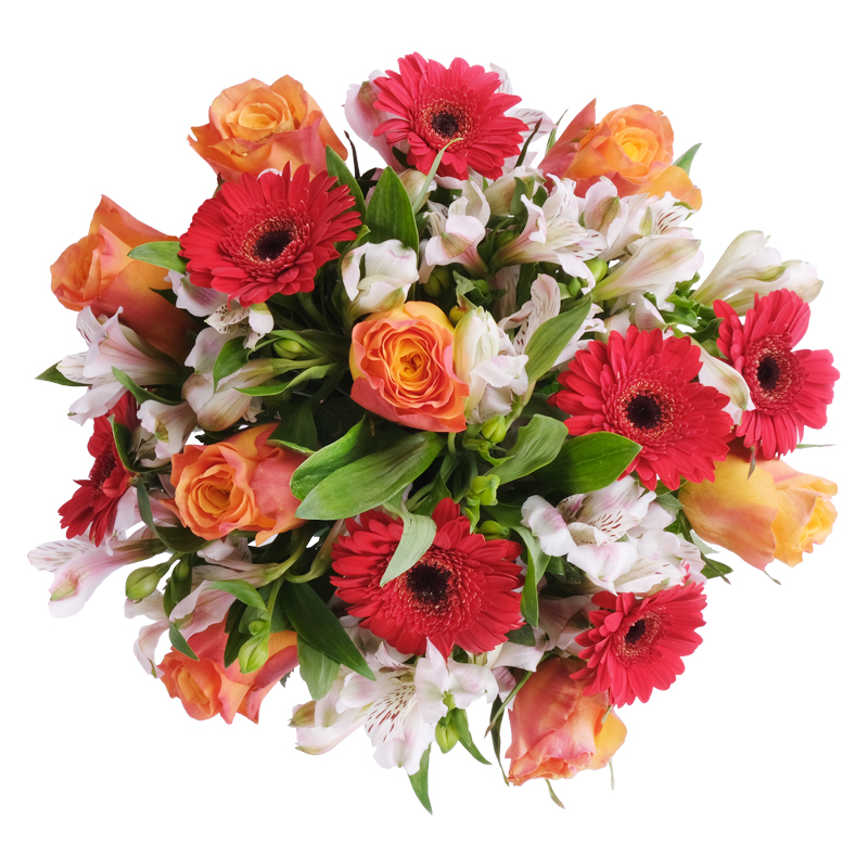 Zawsze świeże kwiaty Harmonijne połączenie trzech pięknych gatunków. Róże wnoszą romantyzm i głębię, gerbery dodają życiowej mocy, alstromerie subtelnie dopełniają, a świeże liście podkreślają naturalność. Perfekcja w klasycznej formie, odpowiednia dla każdej kobiety – bez względu na wiek!
