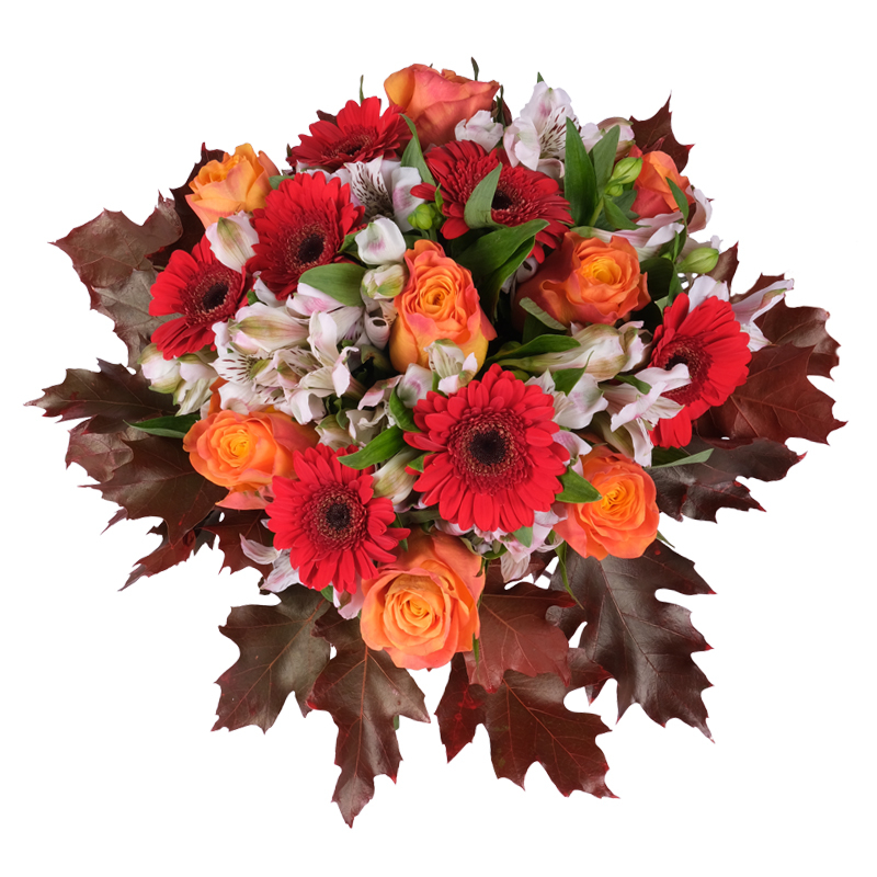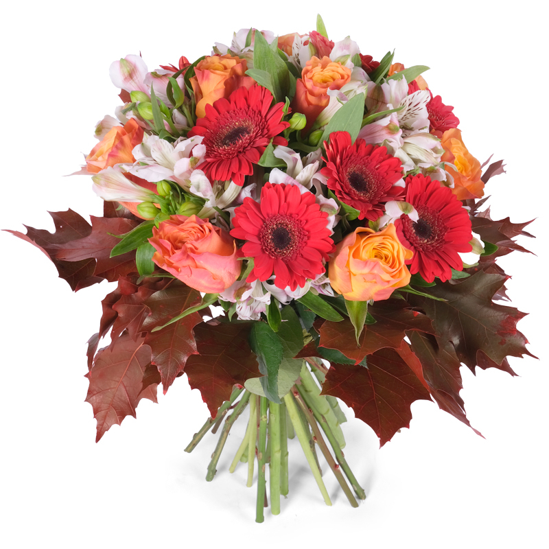 Bukiet z różami, gerberami i alstromeriami to doskonały sposób na wyrażenie uczuć. Liście klonu dodają mu wyjątkowego uroku i głębi. Kompozycja sprawdzi się przy każdej okazji – od podziękowań po gratulacje. Jest elegancka, ale nie przesadzona. Z pewnością zrobi wrażenie na obdarowanym!